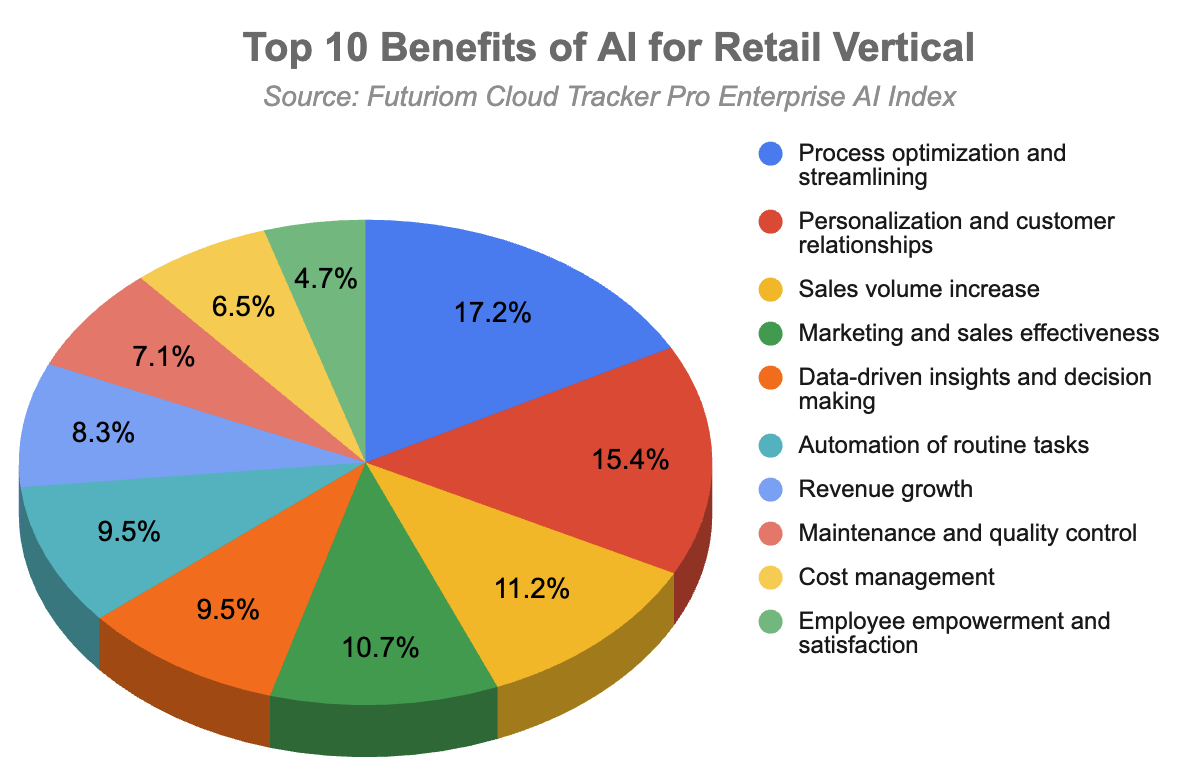 Note: According to Futuriom’s data, collected in over 150 records in our Enterprise AI Index, process optimization and streamlining topped the list of AI’s benefits for the retail vertical, which according to our research is the top vertical sector for AI.